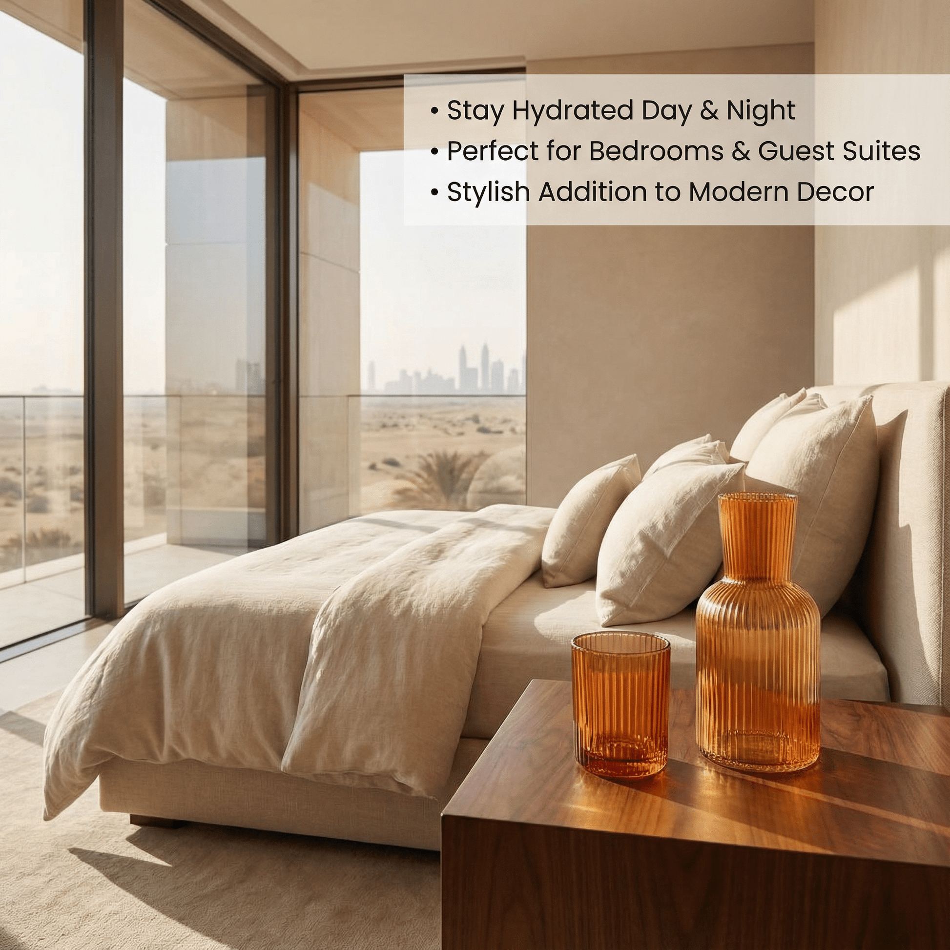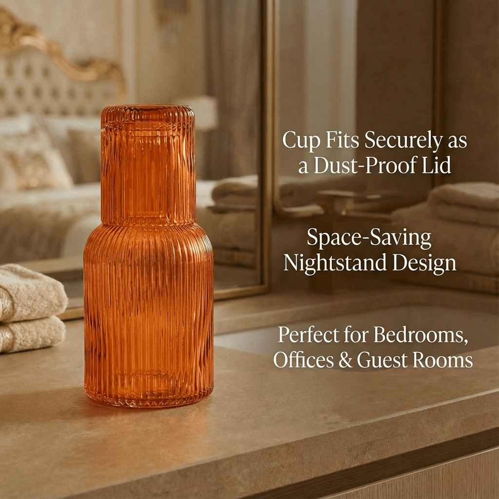 A functional bedside water carafe and cup set designed for everyday hydration and table use. Crafted from durable borosilicate glass, this blue ribbed set adds subtle color while maintaining a clean, practical design suitable for bedrooms, offices, guest rooms, hotels, and hospitality environments.