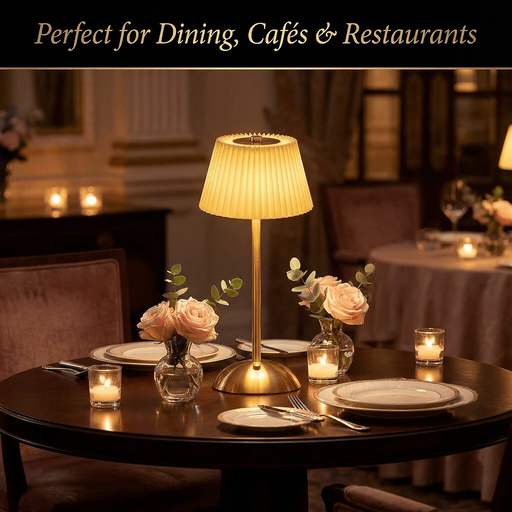 A cordless rechargeable table lamp designed for practical ambient lighting in homes, cafés, restaurants, hotels, and workspaces. Featuring a pleated shade and stable metal base, this lamp provides soft illumination without the need for a constant power connection.