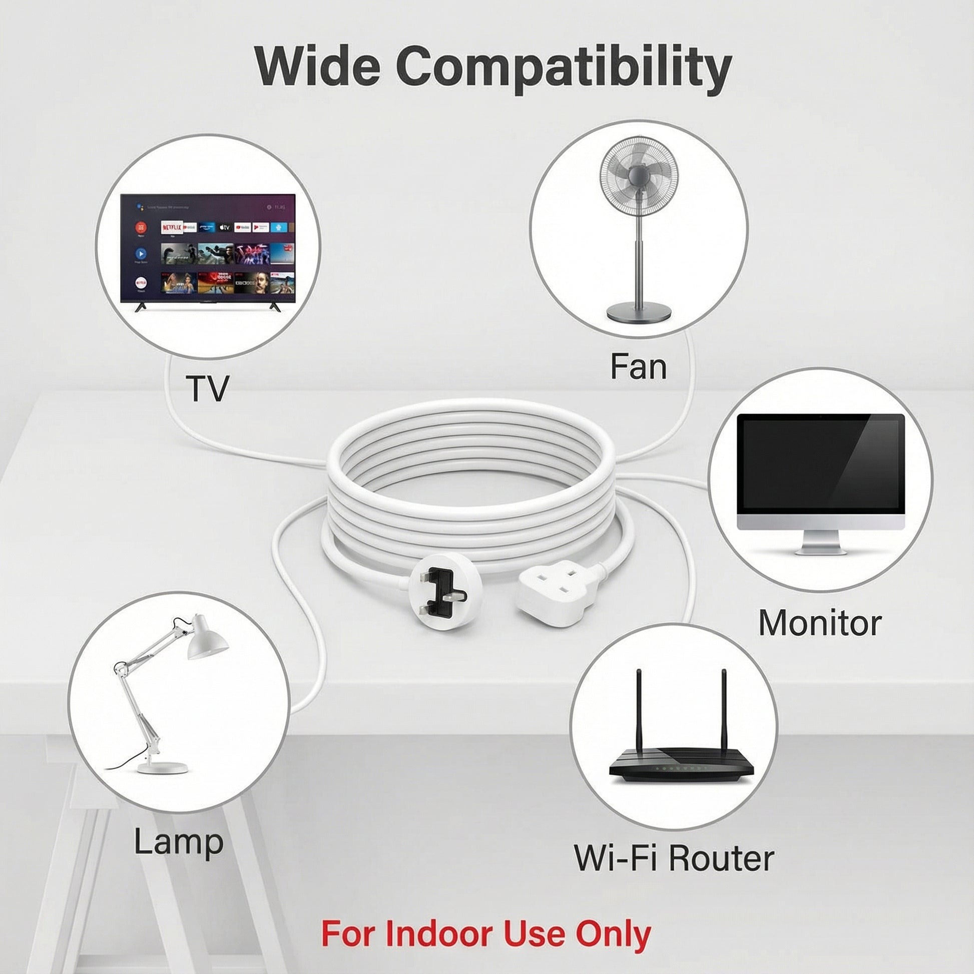 Home and office power extension Desk setups, appliances, and single-device use Reaching distant outlets without multi-socket clutter