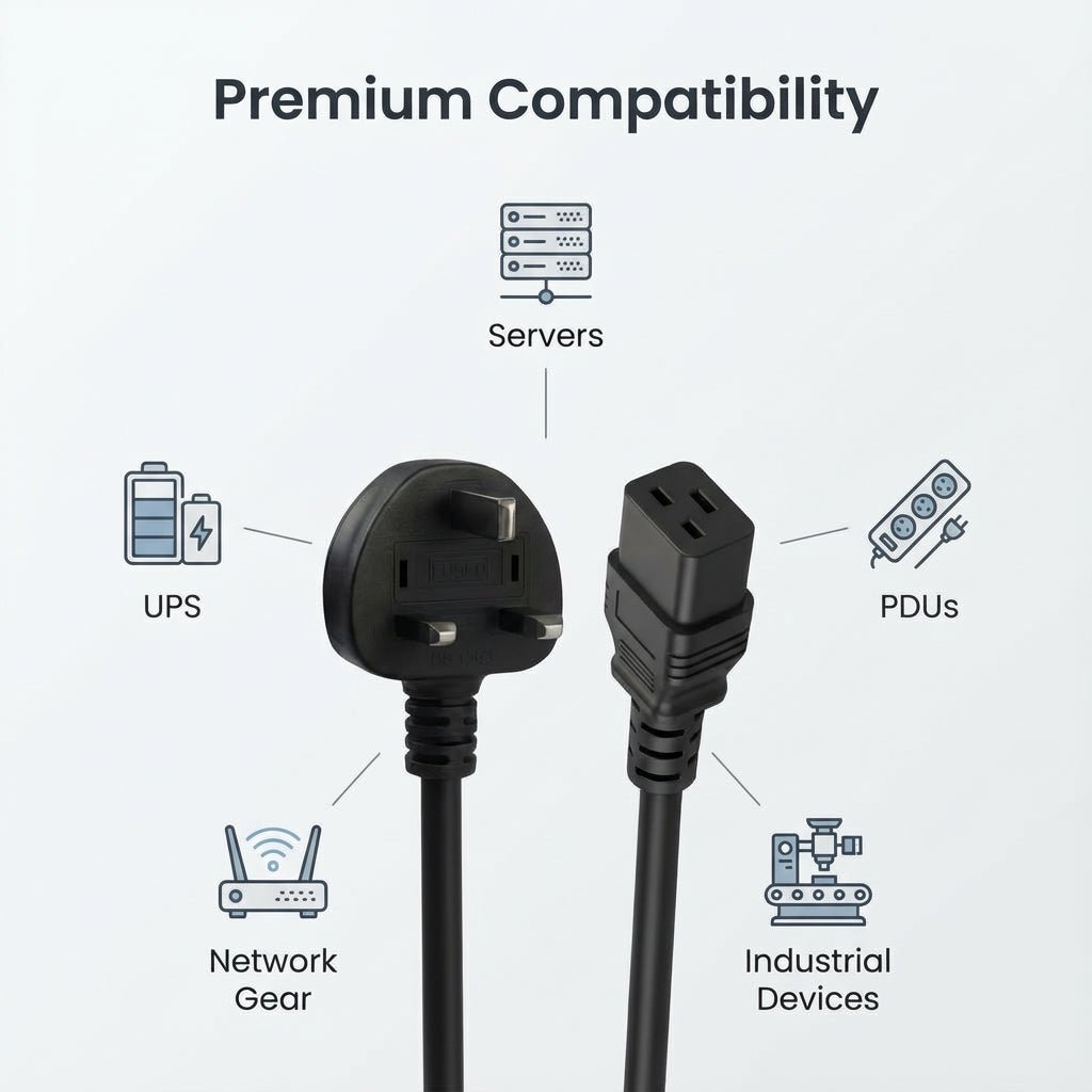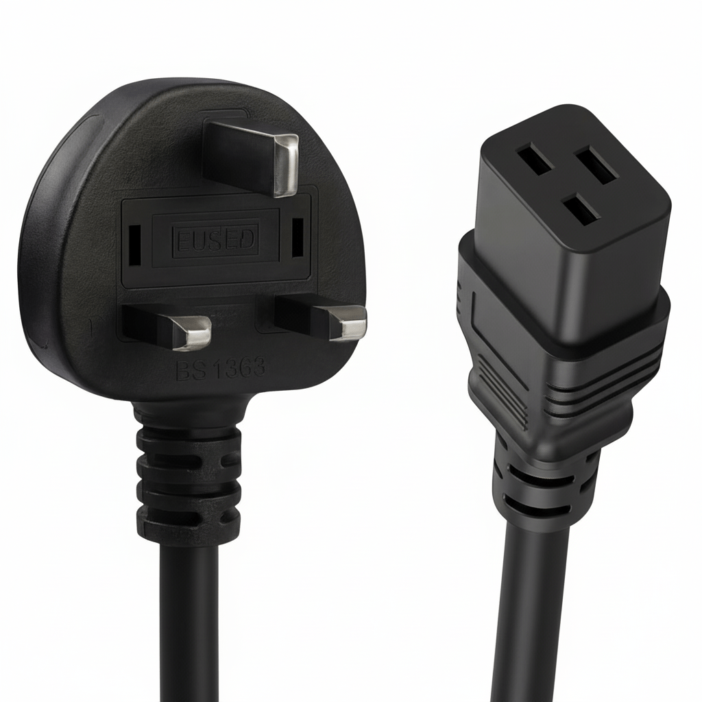 A heavy‑duty UK Type‑G to IEC C19 power cable for compatible IT and power distribution equipment. Designed for dependable use with servers, PDUs, and UPS systems that require a C19 connector.